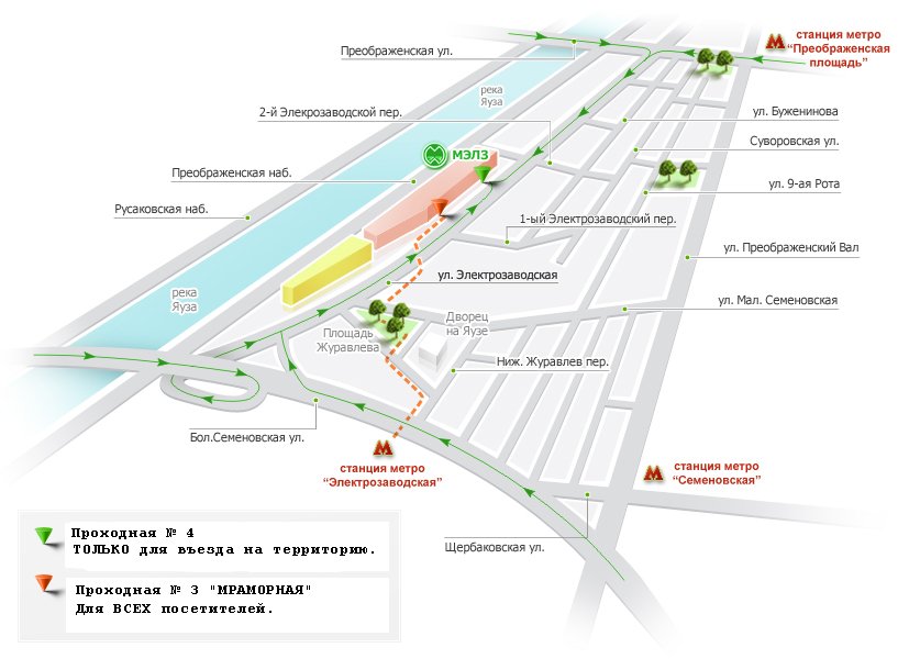 улицы, повернуть направо и идти по левой стороне улицы. Проходная напротив 1-й Электрозаводского переулка